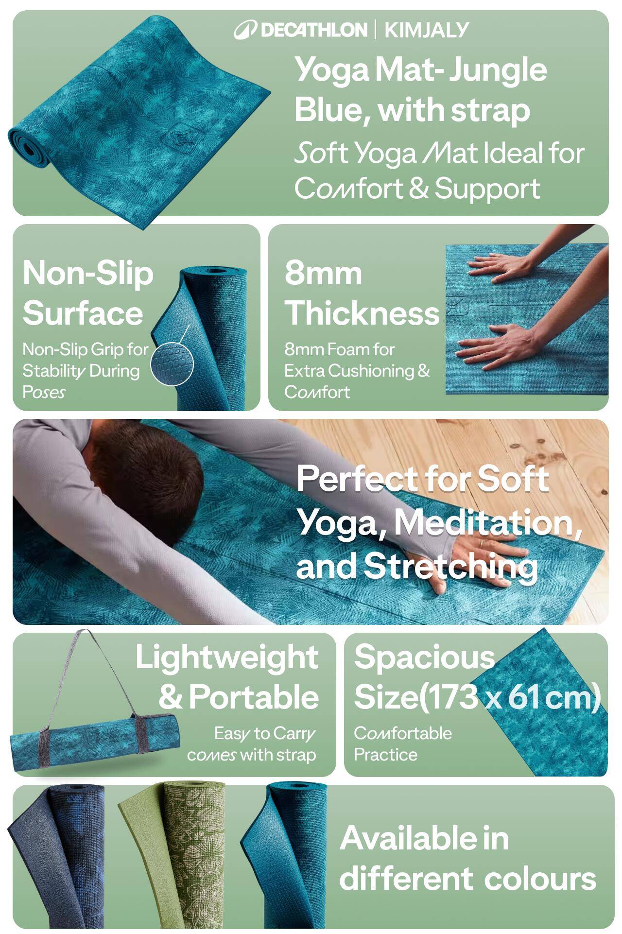 Yoga Mat 8mm Thick, Anti-Slip Foam, 173 x 61 cm with Carry Strap - Jungle Blue