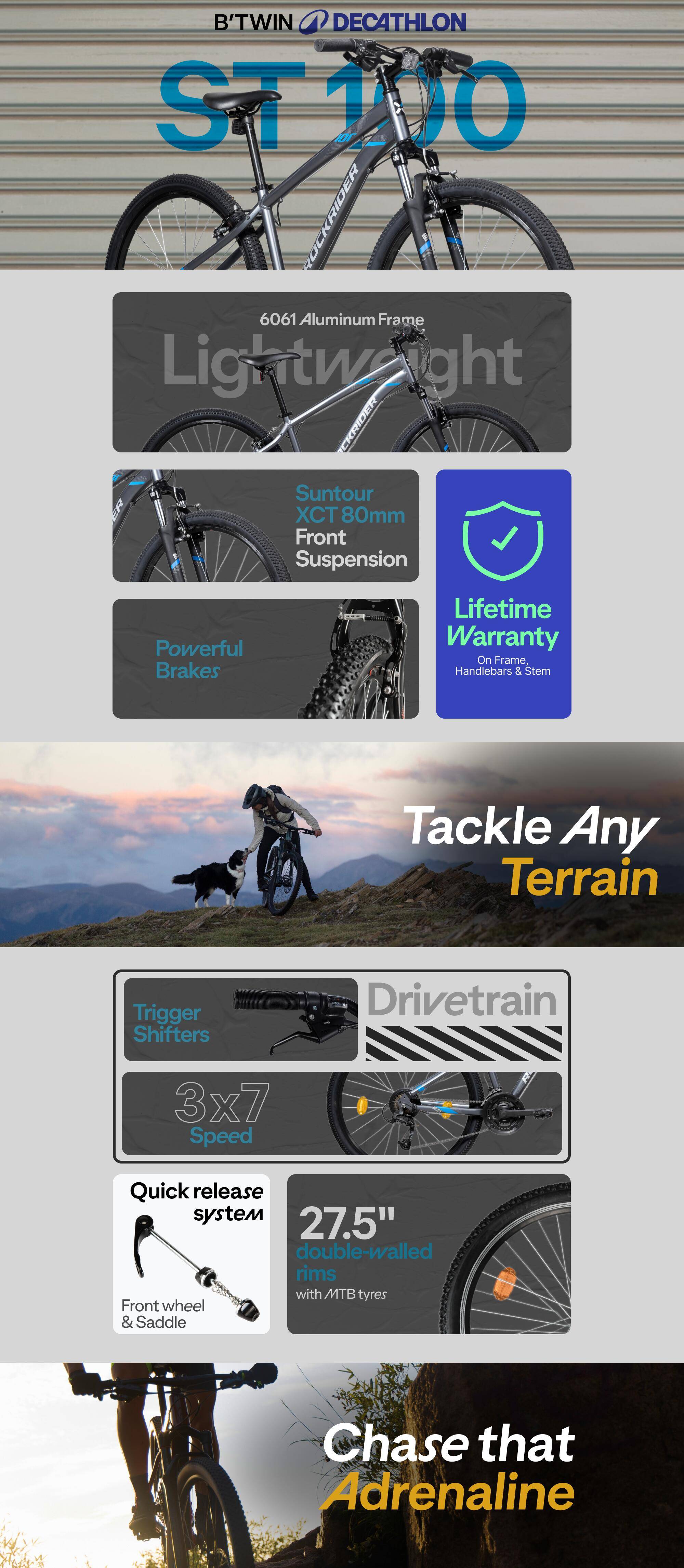 Mountain Bike Rockrider ST100 Grey - Aluminium Frame, 21 Speed, 80mm Suspension