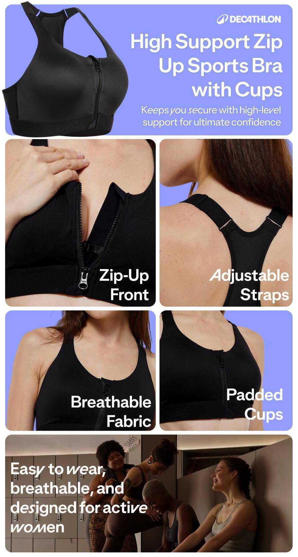 Women Sports Bra, Padded with Zip Detailing, High Support - Black
