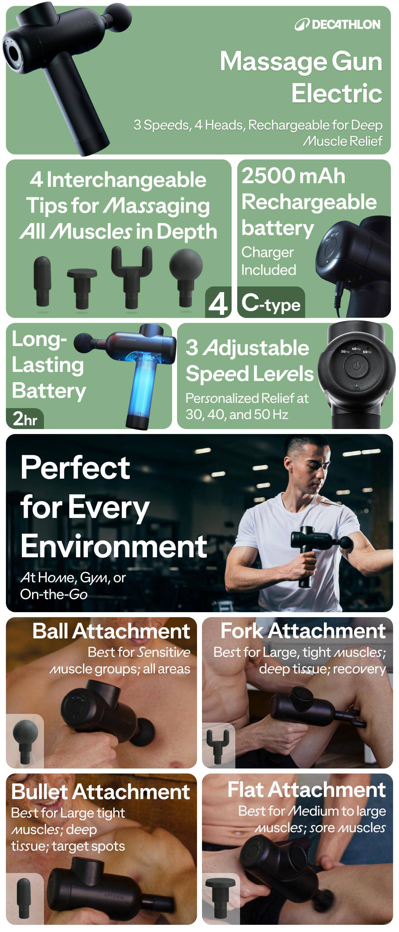 Massage Gun Electric, 3 Speeds, 4 Massage Heads, 45-Min Run Time, Rechargeable