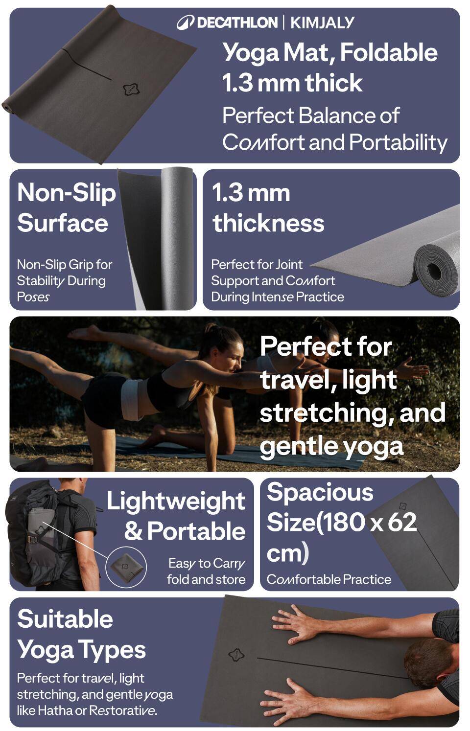 Yoga Mat 1.3mm Thick, Foldable Anti-Slip Rubber, 180 x 62 cm – Grey