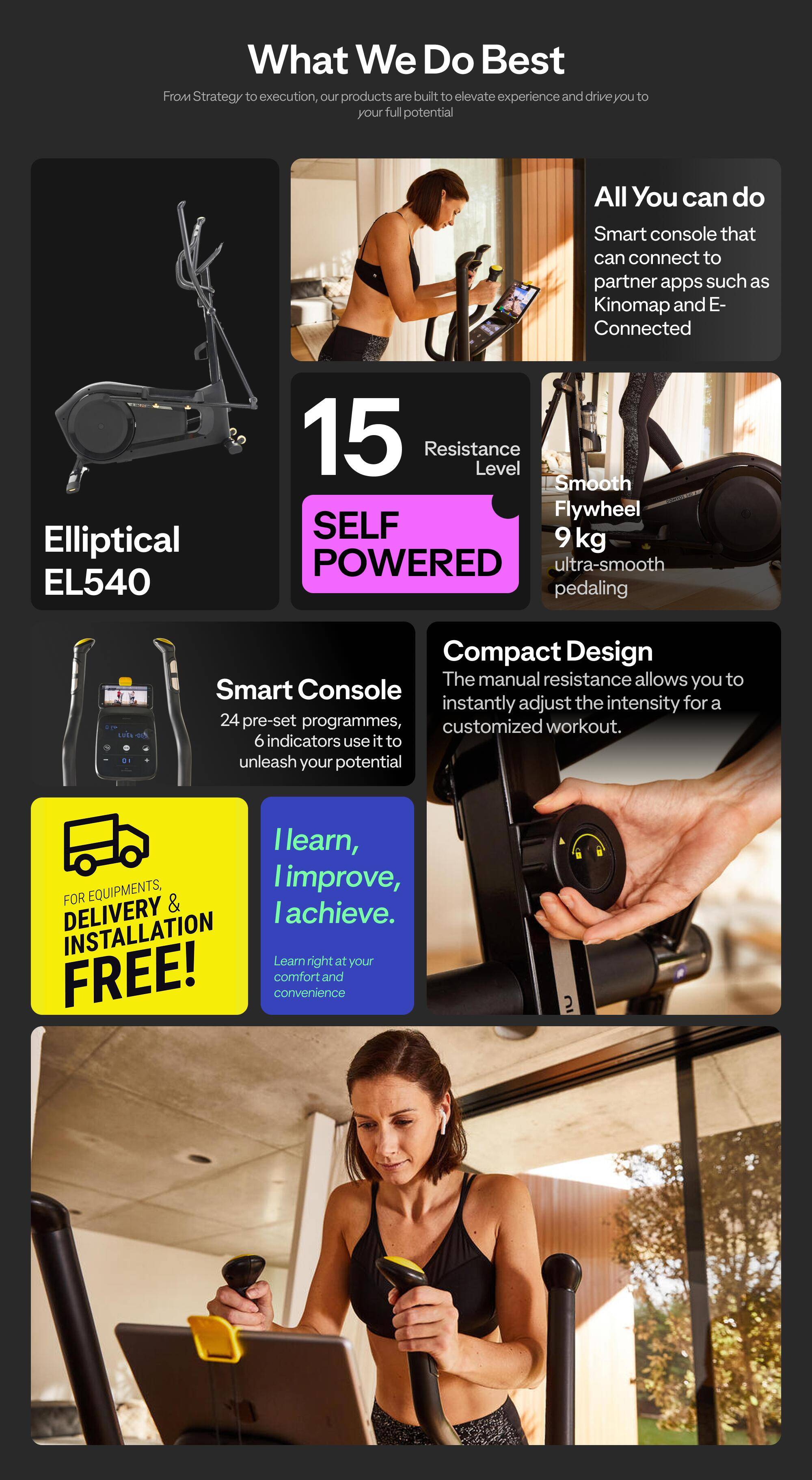 Elliptical with 9kg Flywheel, Smart, Self-Powered, Supports upto 130kg - Black