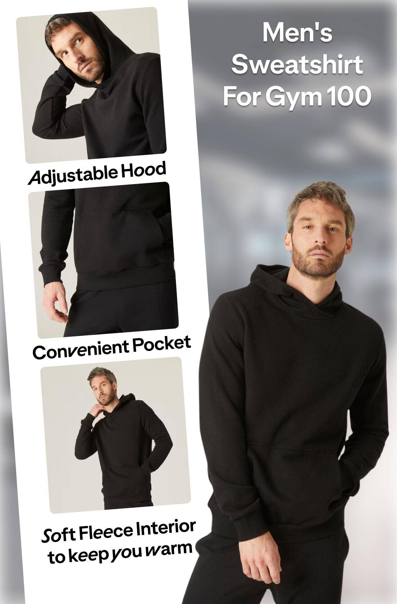 Men Sweatshirt With Hood Fleece 100 For Gym- Black