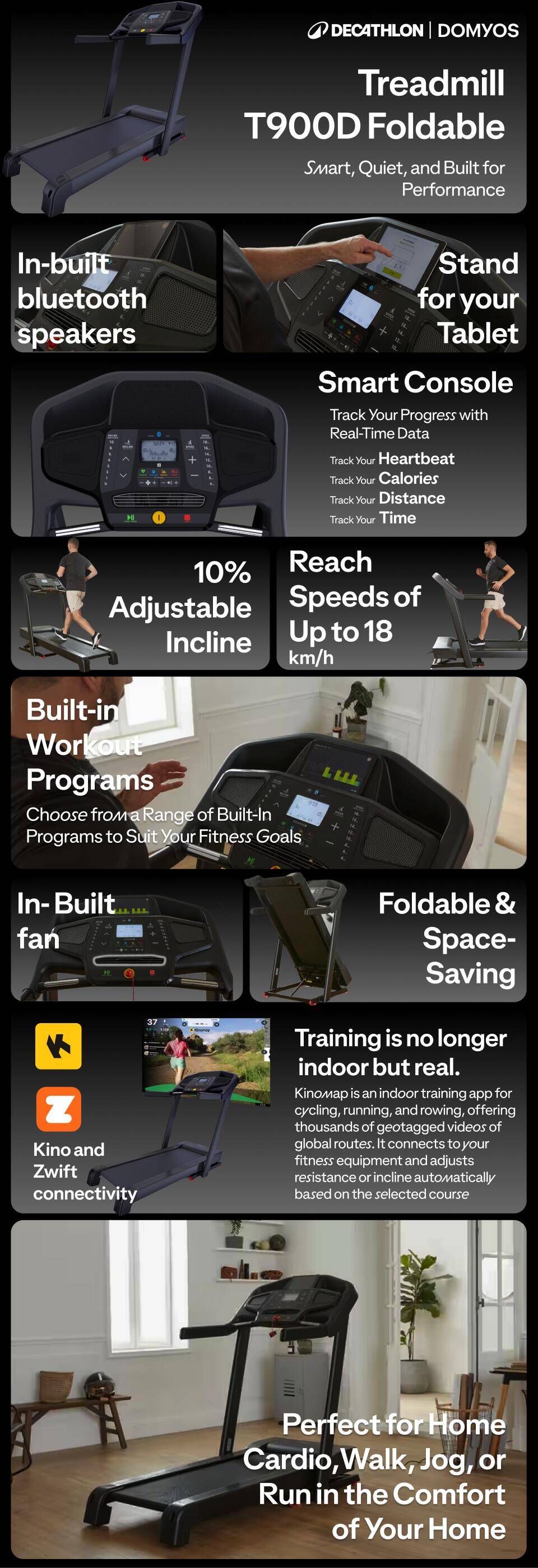 Treadmill Upto 18 kmph, Smart, Foldable, Supports upto 130kg, T900D - Black