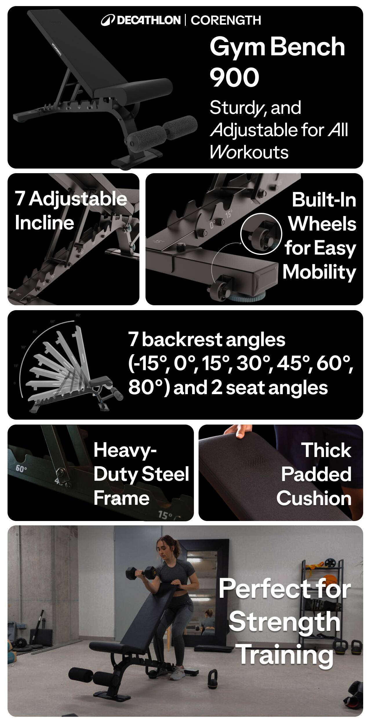Gym Weight Bench with 7 Incline levels, Supports upto 300kg, 900 - Black