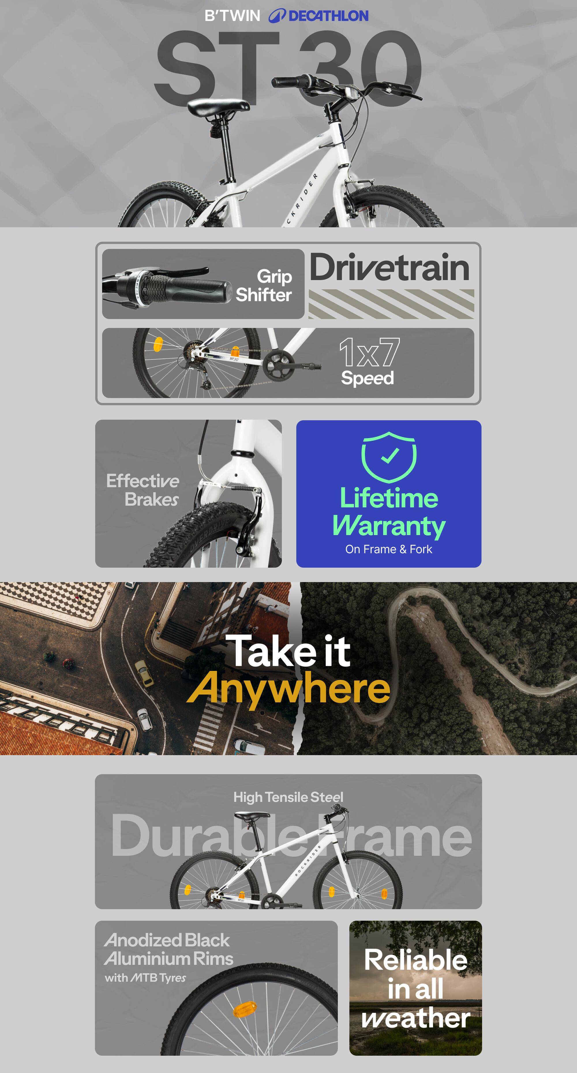 Mountain Bike Rockrider ST30 White - 7 Speed, MTB Tyres, Unisex Frame, V-Brakes